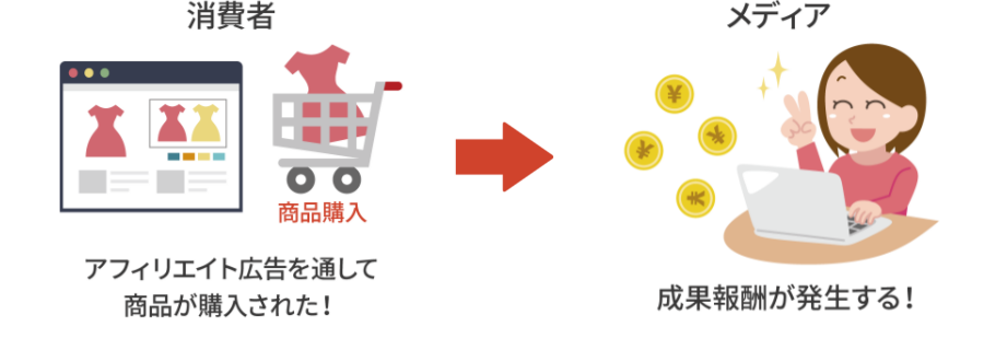アフィリエイトとは「成果報酬型広告」といい、商品やサービスを紹介し、その商品を購入したり登録したりすることで報酬が発生する、という仕組みになっています。